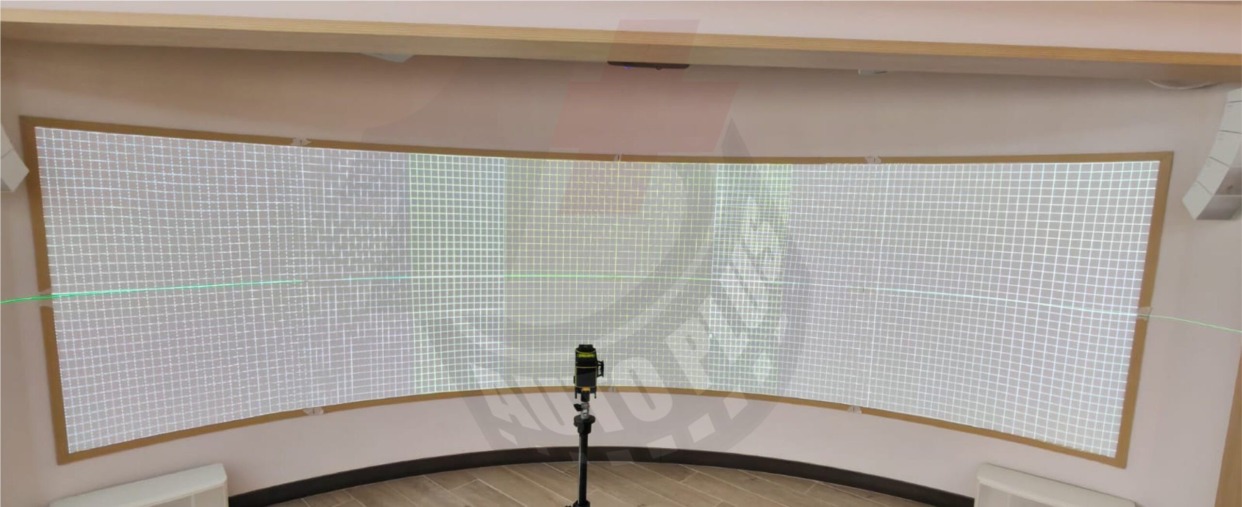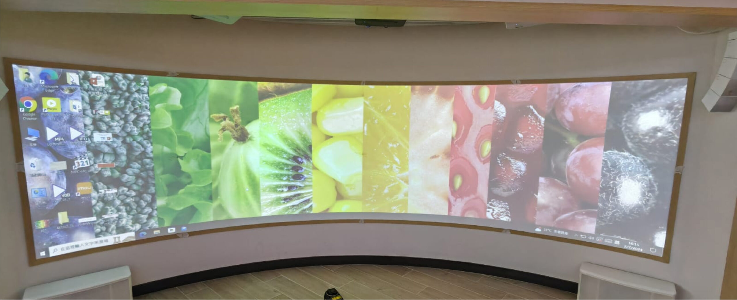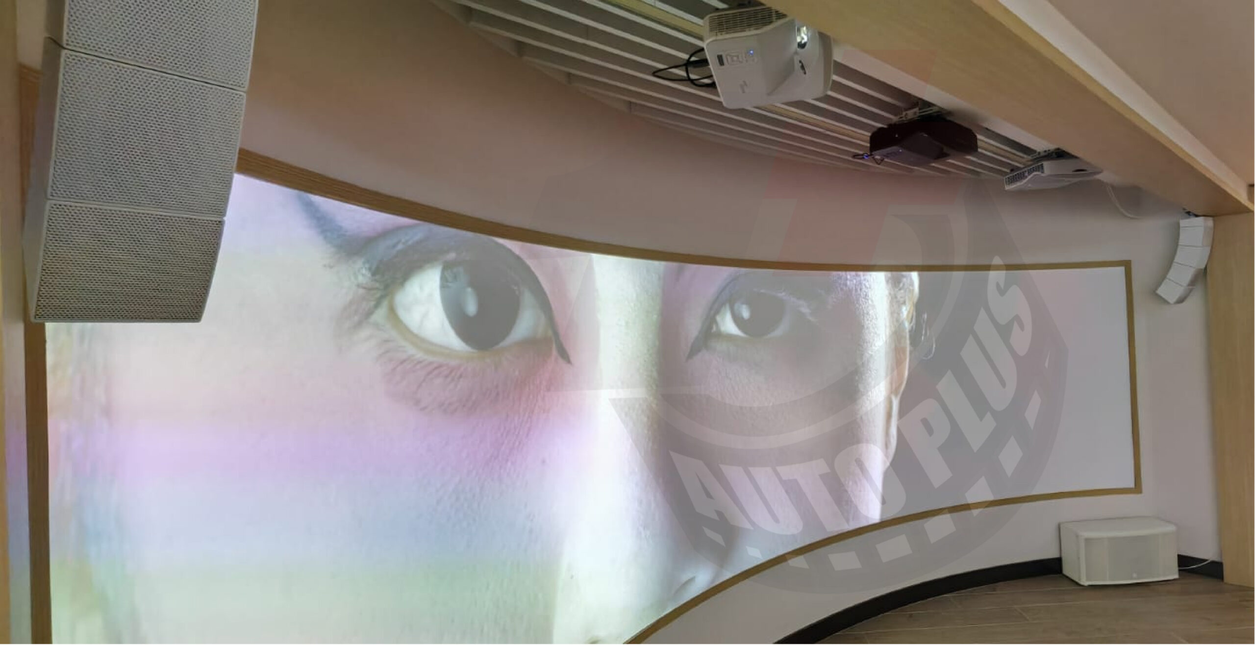 我們工程團隊經過現場考察後,留意到客人要求的畫面尺寸十分大,而且要投出弧型畫面,一部投影機是無法處理得到。