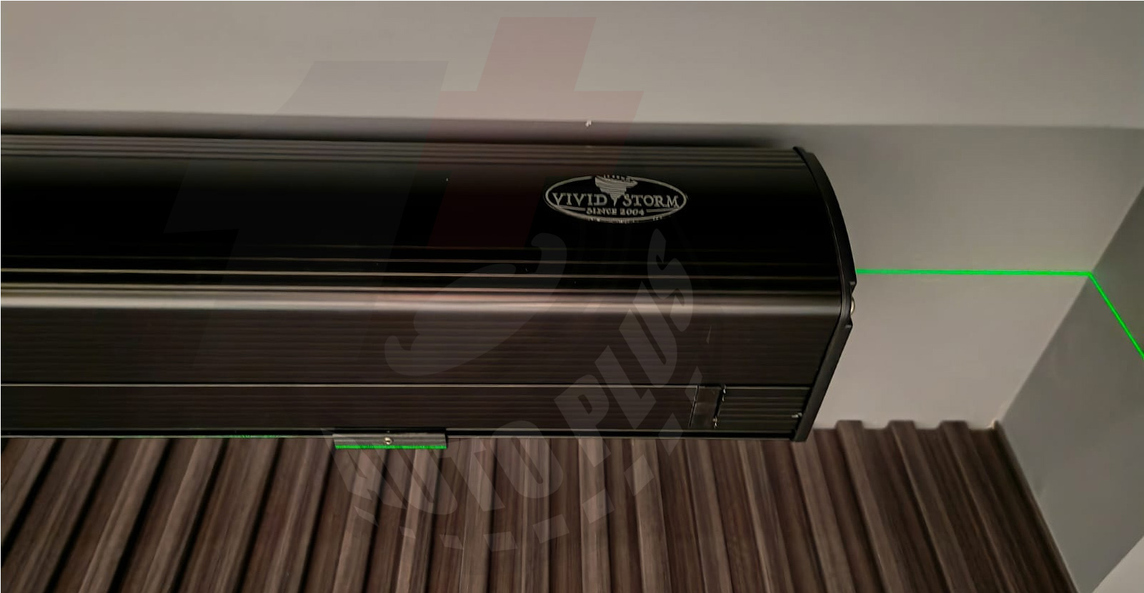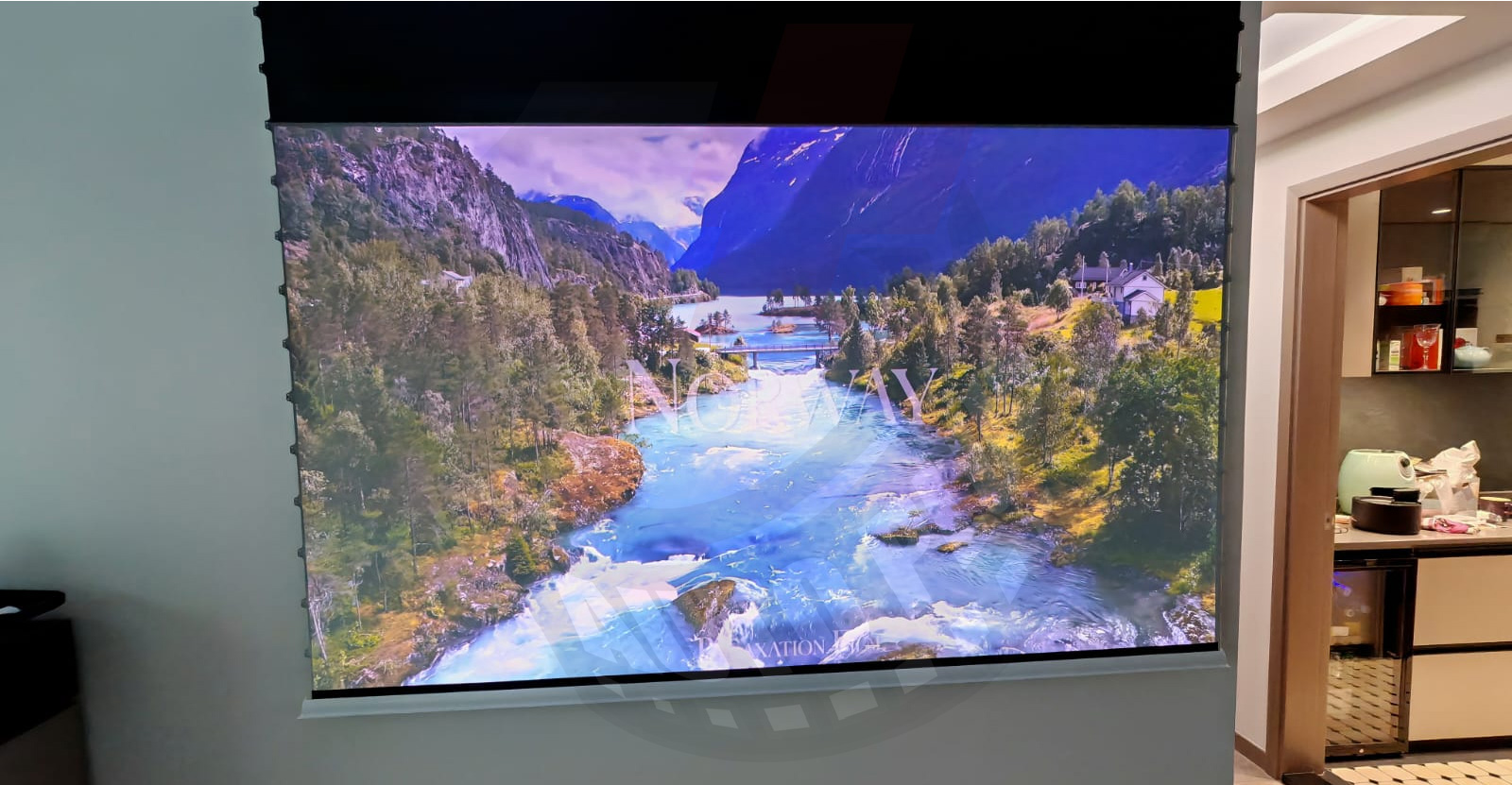 經過多次我們工程團體計算考量後,盡量滿足客人畫面尺寸愈大愈好的要求.最後於影音房裝設Vividstorm 92吋黑柵抗光電動降落幕;客廳則裝設相同款式的84吋.